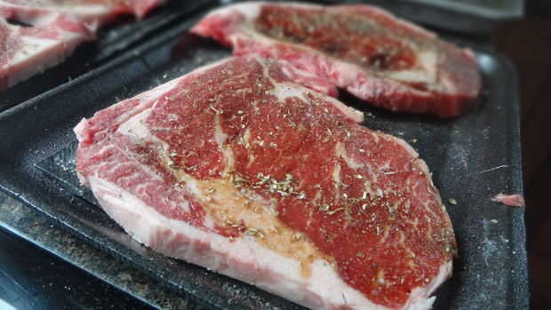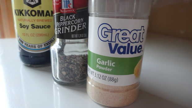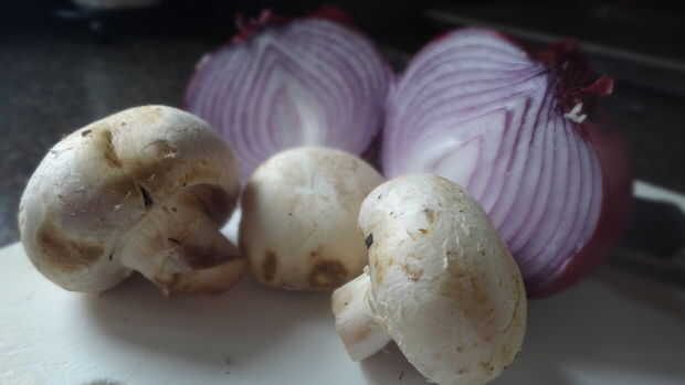 Preparación y sus verduras de temporada mientras esperas. Trocear las cebollas y las setas de cuarto. Sazonar con la sal, pimienta, ajo en polvo, aceite de oliva y un chorrito de salsa de soja. Si no lo tienes usa vinagre balsámico.