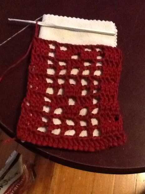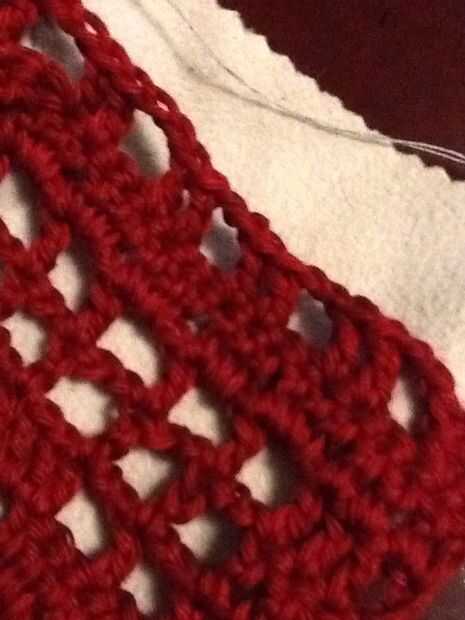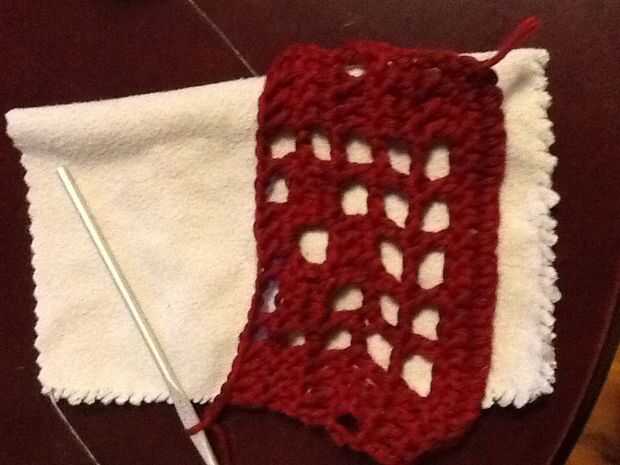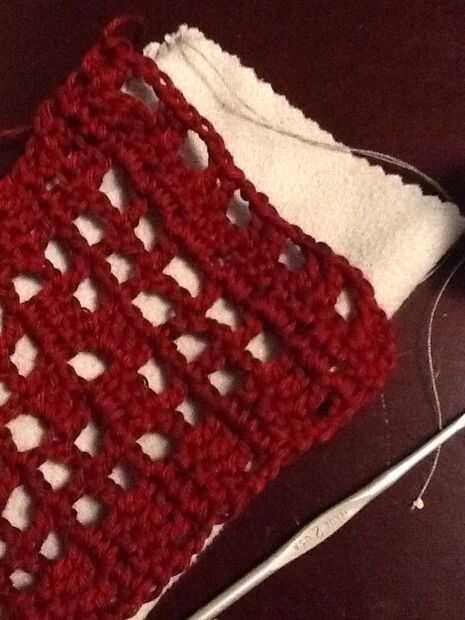 Fila 15: doble crochet en el punto siguiente, cadena dos saltar dos puntos de sutura y luego doble crochet en dos puntos. Repetir todo. Levante último bucle en el gancho grande, quitar el gancho y deslice el hilo restante a través del lazo para cerrar.