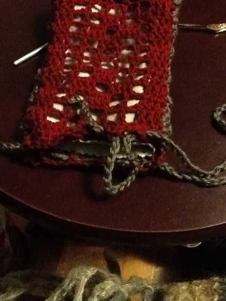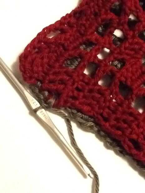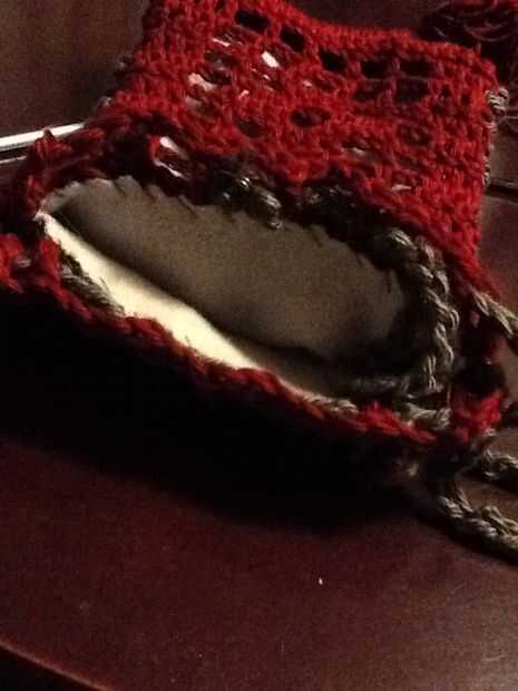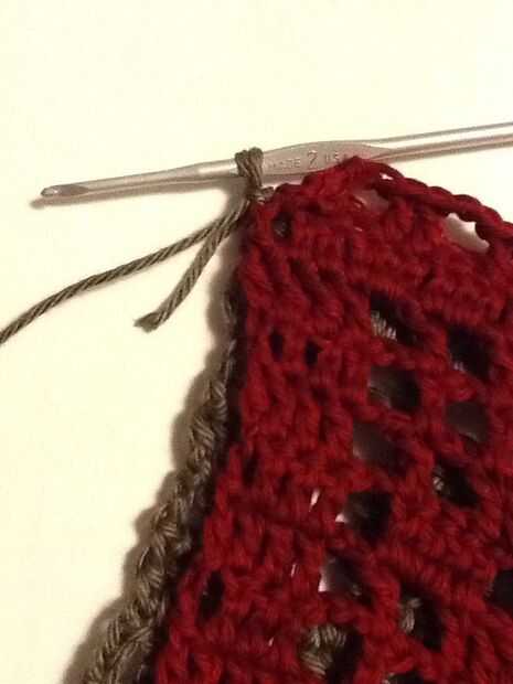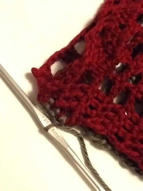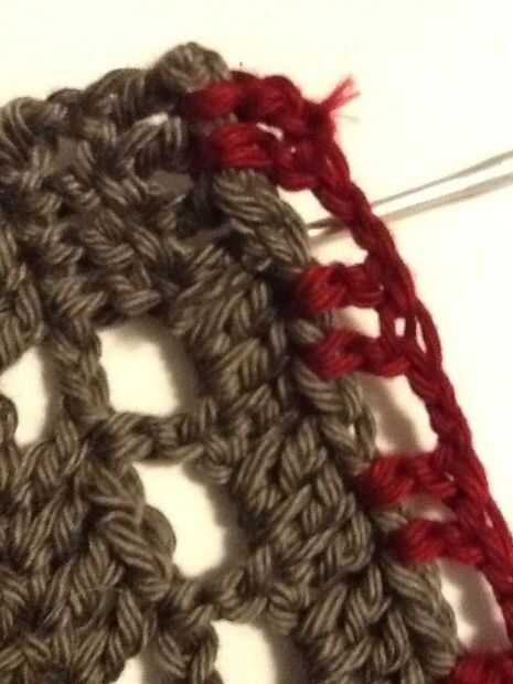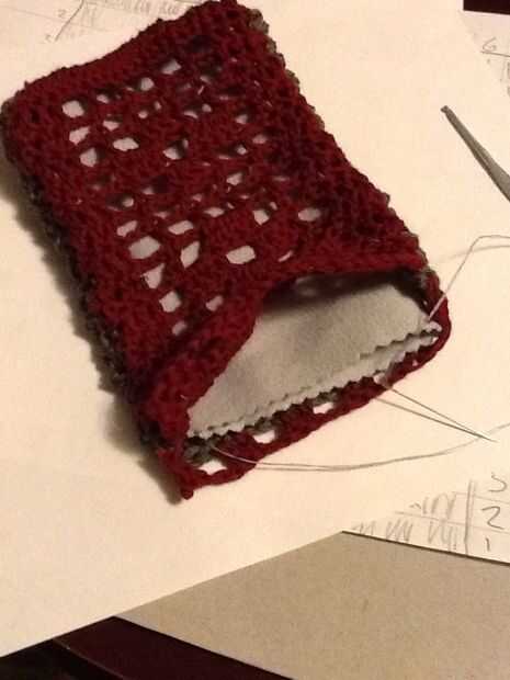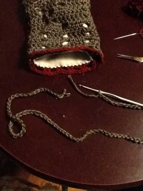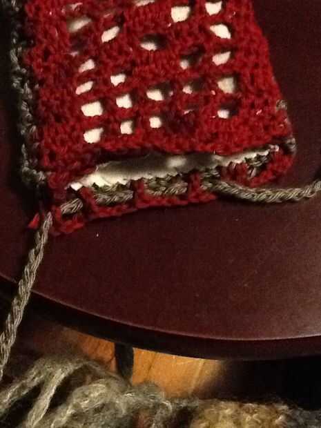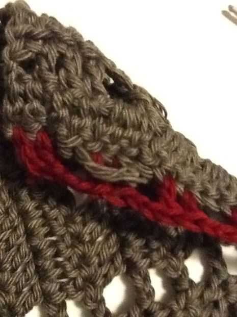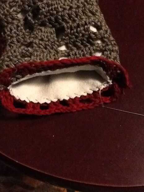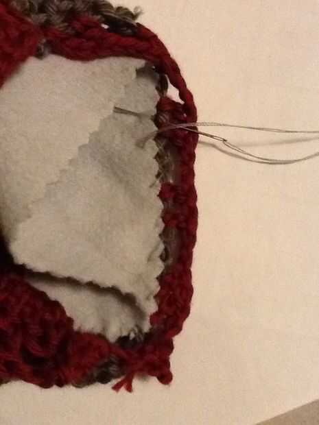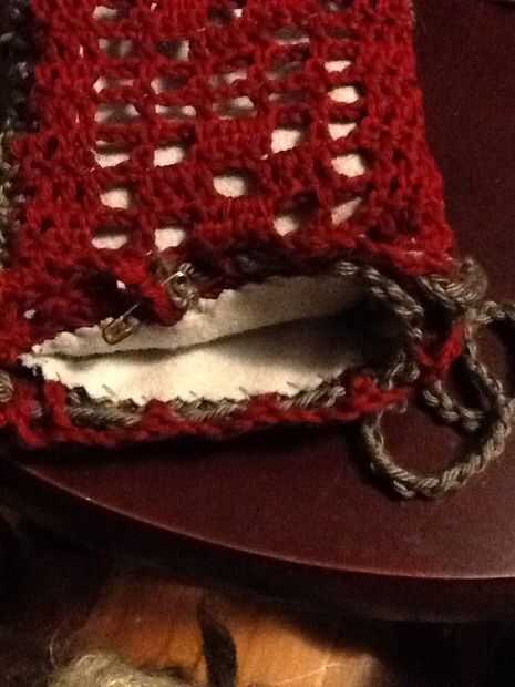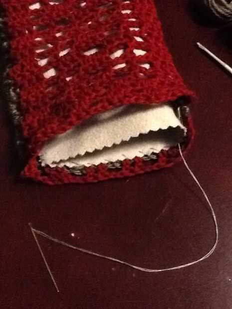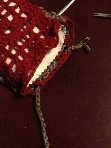 Deslice sobre el revestimiento y forro a shell a lo largo de la abertura de la puntada del azote. Este la fila 14 de la cáscara y picado extremo abierto de la guarnición. Una vez más, usamos el puntadas sueltas bastante largo. Te recomiendo usar un alfiler para marcar el doblez en el forro, como los tamaños no coincidirán exactamente y tienes que cambiar de lado de las piezas de ganchillo al llegar al final de la guarnición, incluso si usted no es el final del ganchillo.