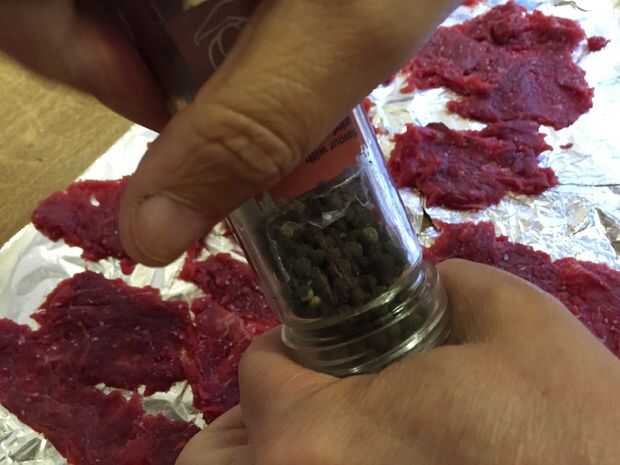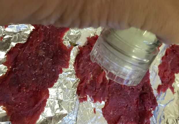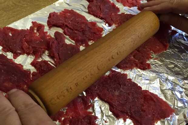 La carne sazonada finalmente se enrolla presionando el condimento en y adelgazamiento más.