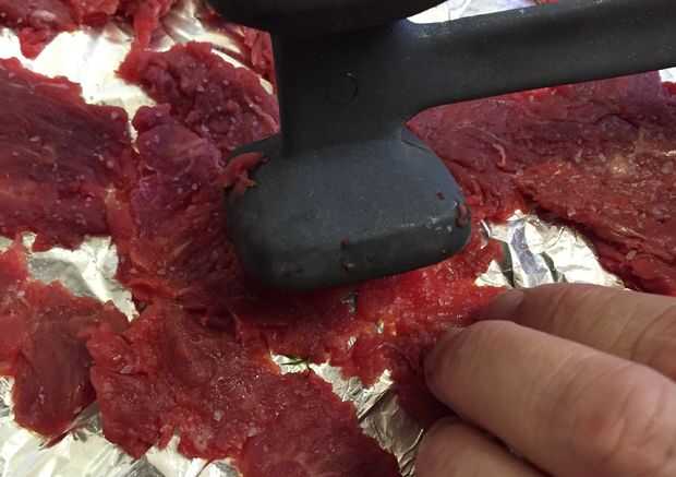 A continuación, hacer que la carne aún más fino, es golpeado con un martillo de carne.