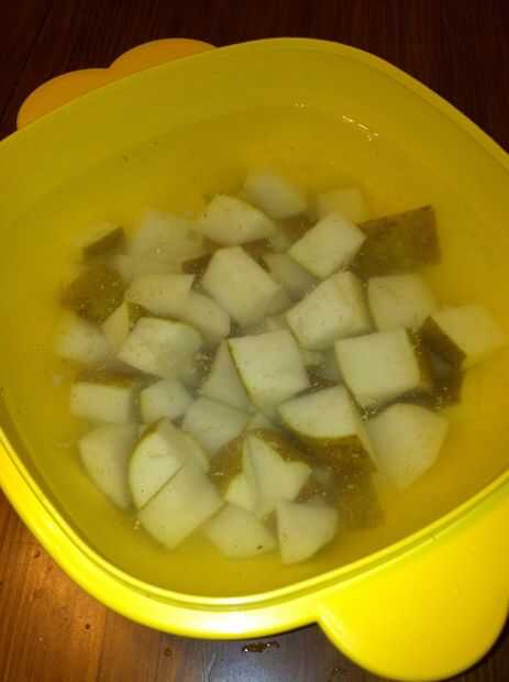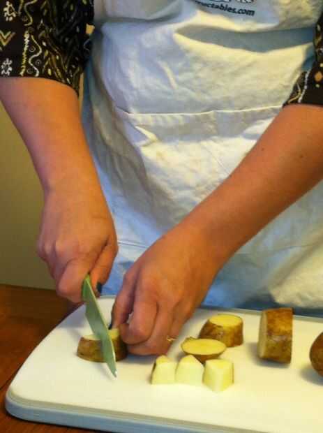 Lave quieras muchas patatas. Pelar si te gusta o deja la piel en. Cortar en trozos de tamaño de un bocado. Poner las patatas cortadas en un bol de agua fría para mantenerlos frescos y puesto a un lado.