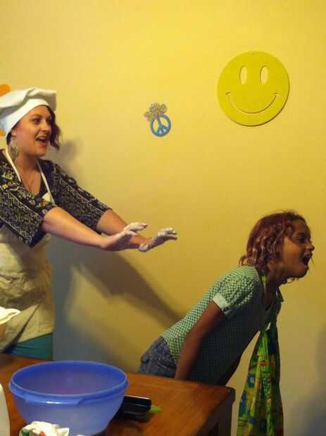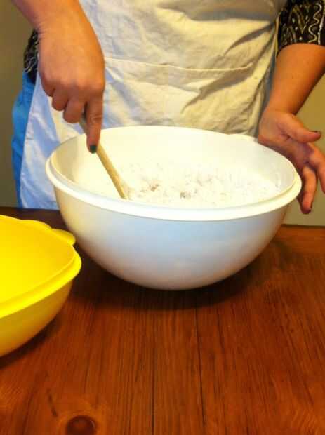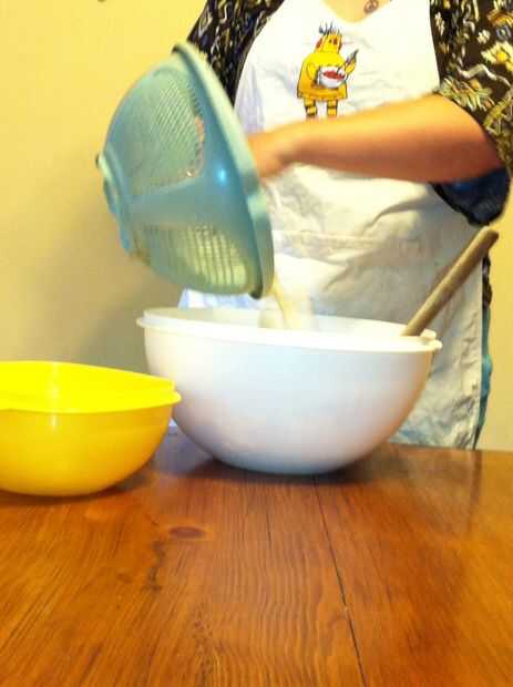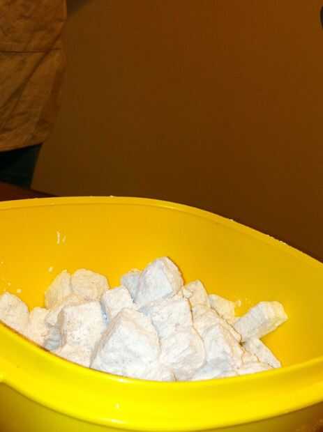 Escurrir las patatas y volcar en la mezcla de harina. Mezclar todo muy bien. El agua extra en ellos les ayudará a conseguir bien cubiertas. Las manos se consigue realmente sucias, así que tener a mano algo para limpiar en liiiiiiiike... el niño más cercano!
