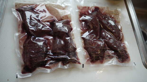 Usted necesita para asegurarse de que tiene un espesor máximo conocido de carne en la bolsa sellada, para no superponer piezas. Tiempo de cocción se basa en el espesor (ver enlace en el paso uno), para no superponer piezas. (ver foto de qué piezas fueron arregladas en bolsa sellada). Estos filetes de 31,5 mm (1,25 pulgadas) tomaron aproximadamente una hora.