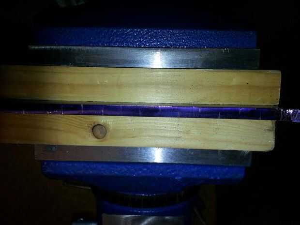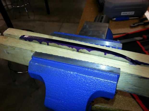 Una vez que una capa suficientemente oscura de diseño tinte en la pieza, es tiempo de trazar sus líneas de molienda, basadas en su diseño. Para asegurar la pieza correctamente, es una buena idea para el trabajo la tirada en un tornillo de banco para no migra, la pieza de trabajo mientras usted está presentando. La mejor manera de hacerlo sin escopleando con gubia el cuchillo o hacer más trabajo para ti es la lámina entre dos trozos de madera de la cuña y apriételos en un vicio.
