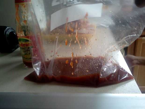 De todas formas, se combinan todos los otros ingredientes (vinagre, salsa de tomate, salsa de soja, cerveza inglesa del jengibre y ajo en polvo) en la bolsa zip-lock.
