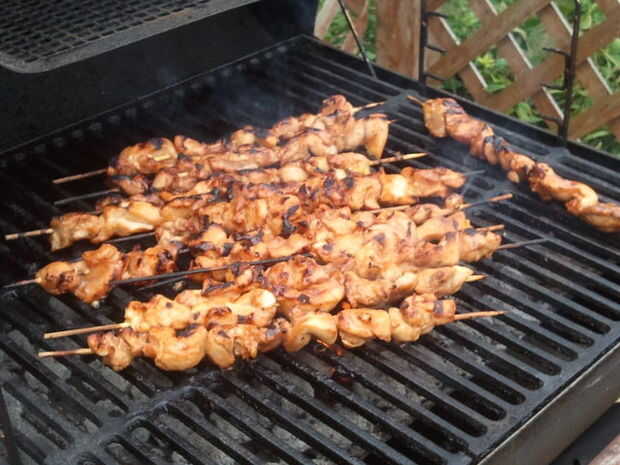 Me soplo pollos en mi jardín. Un pollo se anotó hasta el hueso. Marinado con cilantro picado (cilantro) raíz, cúrcuma fresca, chiles, salsa de pescado y azúcar de Palma. Lemongrass es relleno en la cavidad y se alza sobre una botella de cerveza.Un ta