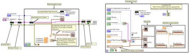 El código que he proporcionado se construye fuera de los proyectos anteriores. Usted puede haber notado hay dos estructuras de bucle. La primera es lo que me refiero a los "datos Aquistion Loop" que básicamente Lee los datos desde el chipKIT tan rápidamente como sea posible. El segundo bucle me refiero a como el "bucle de cálculo". Este bucle encarga de los cálculos que queremos hacer con los datos. La razón de que separar las operaciones de adquisición de datos de los cálculos de datos es mejorar el rendimiento. LabVIEW es lo suficientemente inteligente como para compilar el código en cada lazo para que corra en un núcleo separado de su procesador.