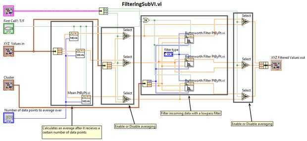 De la filtración en este proyecto se realiza en un subVI personalizado. Este subVI ayuda a mantener el código limpio y entendible. Dentro el subVI hay dos tipos de métodos de filtro empleados. La primera es de promedio simple, y la segunda es filtrado bajo de Butterworth pasa. Cada método de filtrado tiene una selección de On/Off del interruptor. Cuando el interruptor está encendido, escupe los datos filtrados. Cuando el interruptor está apagado, escupe los datos sin filtrar.