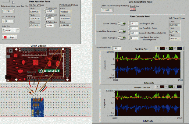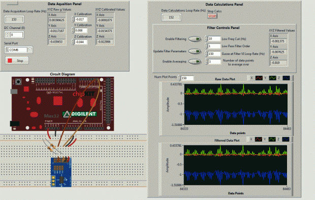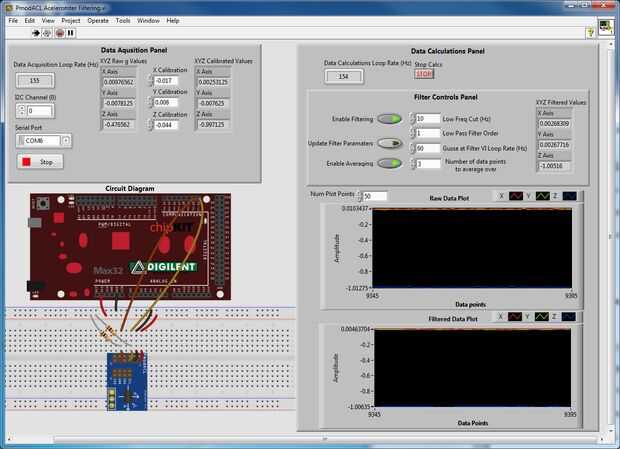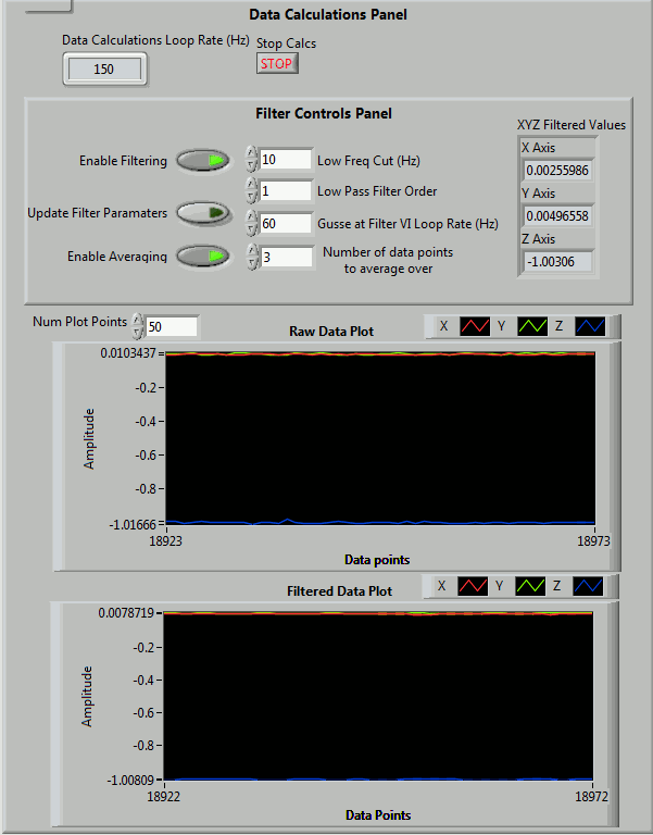 Para obtener buenos resultados de filtrado debe entender cómo correctamente los parámetros y operar el programa. Primero apagado es importante tener en cuenta que estamos utilizando dos lazos en este VI. El primer bucle actualiza el "Panel de adquisición de datos", y el segundo actualiza el Panel de "datos cálculos". Cada lazo tiene su propio botón de parada separado, así que que para detener el VI entero debe golpear ambos botones de parada uno tras otro.