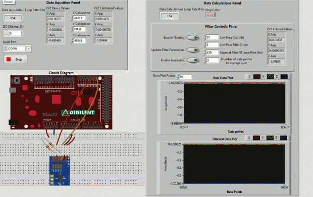 En el Panel de datos cálculos puedes ver existen dos datos. Uno muestra los datos en bruto antes de se filtra, el otro muestra los datos después de que ha sido filtrado. Comparando ambos diagramas podemos ver el efecto que ha tenido nuestro filtro. Los datos de parcelas continuamente datos como sea recibida. Puede controlar el número de puntos de datos aparece en cada parcela mediante el control de "Num trama de puntos" . Esto esencialmente le permite ampliar las parcelas o como