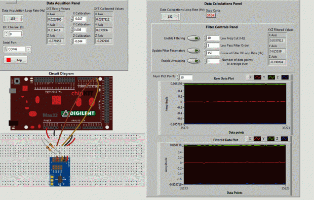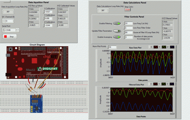 A continuación vamos a ver cómo el paso bajo filtro efectos nuestros resultados. Por lo tanto, para esta parte se deshabilitará el filtro promedio. Empezar otra vez, agitando constantemente el acelerómetro para generar algo de ruido para calibrar el filtro con. Intente activar/desactivar el filtro de paso bajo para