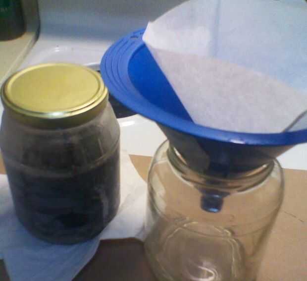 Paso 4-agitar los frascos bien otra vez para aflojar para arriba el carbón. Vierta el vodka frío en el filtro y espere hasta que el embudo esté vacío, repita según sea necesario para vaciar la jarra.