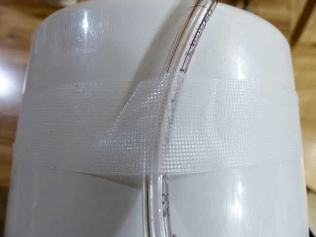 Una vez que el adhesivo ha curado completamente, y para asegurar la acción de sifón, la cinta se utiliza para sujetar el tubo al lado del contenedor.
