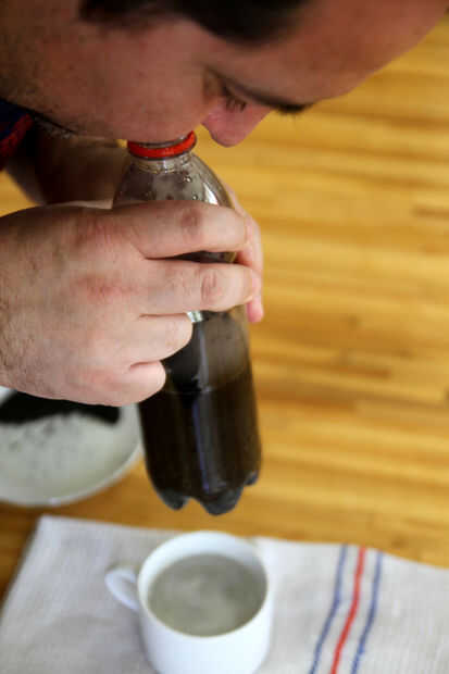 Una vez pre-filtro de agua sucia en su biberón con carbón activado, necesita solo se aplica presión de aire a la botella. Puede soplar aire en la botella con la boca, esto aumentará la presión en la botella, esto hará que el sucio agua ir a través de carbón activado y de la botella a través de pequeños agujeros perforados en la parte inferior de la botella.
