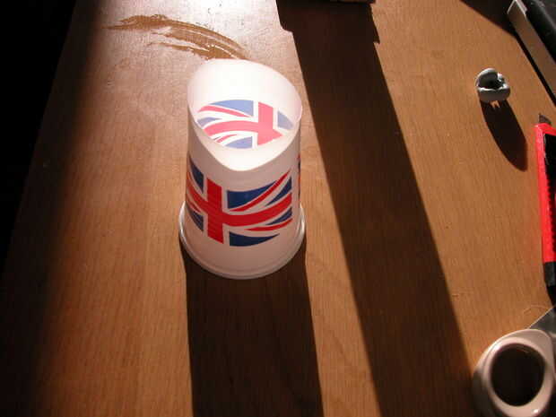 corte el fondo de la taza plástica con las tijeras. ahora debería poder ver a través de la Copa como si fuera un tubo.