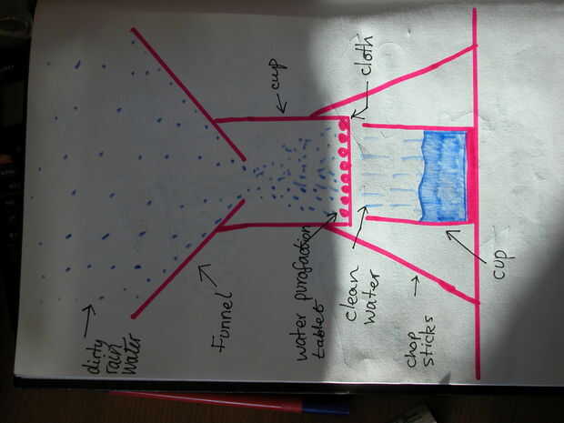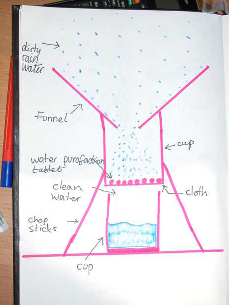 como la lluvia es recogida por el embudo cae en la taza donde pasa a través de la capa de tabletas de purificación luego pasa lentamente a través de la bruja de paño mantiene a ramas y errores entonces gotas en la taza bajo el agua.