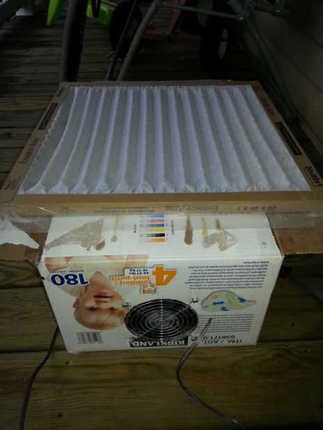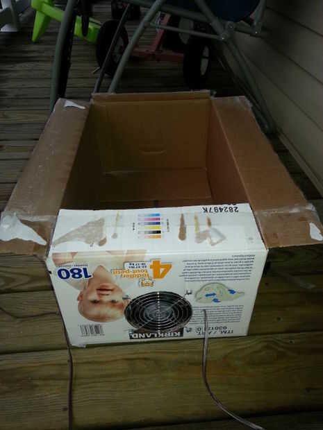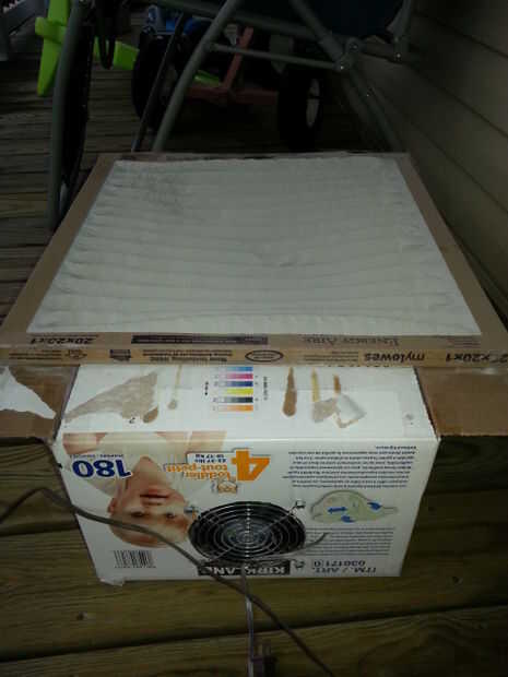 He intentado encontrar una caja que estaba cerca del mismo tamaño que los filtros de aire que tenía para mi casa. Una caja de pañales estaba lo suficientemente cerca. He centrado el filtro con un borde y luego girar la parte superior doblar cualquier hacia fuera para ampliar o para reducir la abertura de la caja. Tomé un viejo ventilador de una electrónica gabinete, corte un agujero para las cuchillas y poked 5 agujeros en el cartón para los tornillos y cable para pasar.