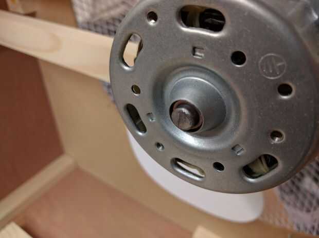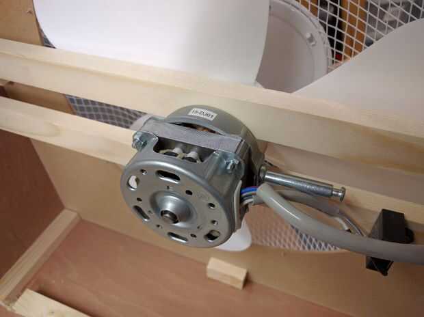 El ventilador vino de un ventilador de pedestal barato de Argos. Las aspas del ventilador encuentra bastante lejos del cuerpo del motor por lo que acortó la longitud del eje moviendo el rotor hacia abajo y ajuste del eje de exceso.