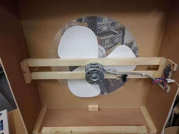 Luego fue montar el ventilador en dos piezas de madera, esto fue hecha usando los puntos de montaje original que une el cuerpo del motor en su carcasa de plástico.