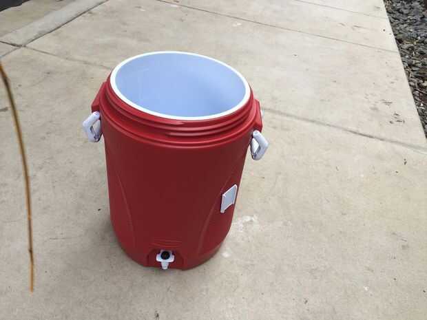 El iglú es va a ser el exterior interior para nuestro filtro de carbón. Puede también utilizar un balde y luego fije un sistema de drenaje que. Para esto vamos a utilizar el iglú desde su ya cuenta con una boquilla de drenaje conectada. Estos igloos de 5 galones cuestan alrededor de $18-25 dólares de los E.E.U.U. y pueden encontrarse en sus tiendas minoristas locales. Las manijas en el iglú ayudan a transportar el filtro alrededor.