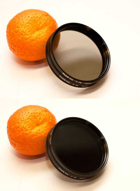 Ahora podría atornillar el filtro CPL invertida sobre el original, para que esta última permanece en el lado de la cámara, y que modificado se queda fuera. Entonces usted puede probar el filtro en una fuente de luz normal. Veo muy bien el comportamiento de filtro ND variable en estas imágenes. Filtros están alineados en la primera foto, y son perpendiculares en segunda, donde no hay tostadas pasaría a través de las rejillas... NOP! la luz no pasaría a través de las gafas!