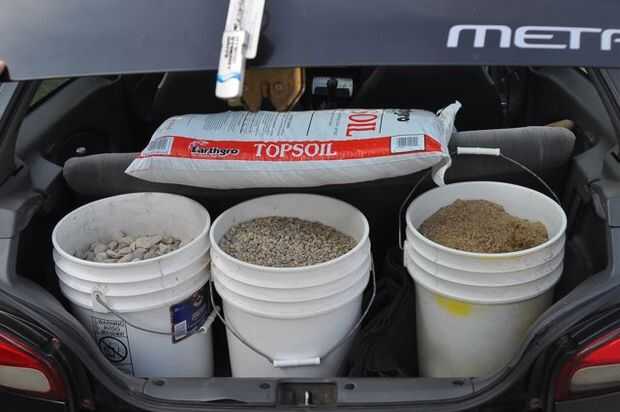 En primer lugar, salta en su coche eléctrico de fabricación casera y en coche a la tienda local de suministro de jardinería. Consiga algunas piedras grandes pequeños guijarros de piedras, arena, suciedad (si no tienes algunos) y tela de jardinería.