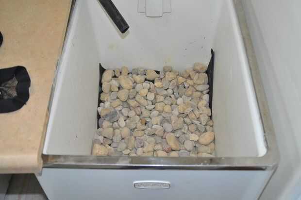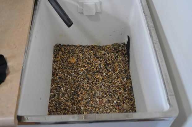 3) una capa de guijarros. (Debe hacer una capa más o menos sólida. Las piedras deben ser lo suficientemente grandes como para no caer a través de los espacios entre las rocas más grandes).