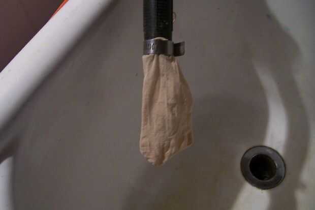 1) esta opción funciona mejor si tiene la manguera de descarga de un lavabo, bañera o fregadero. El recipiente de retención impide que el nylon estirar demasiado.