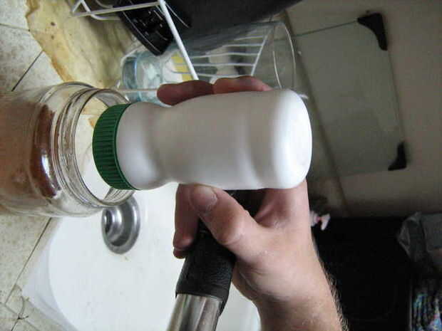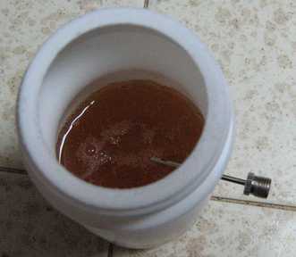 - Con la punta de la cuchilla, gire una punción muy pequeña en el centro del recipiente de filtrado.