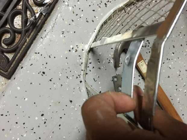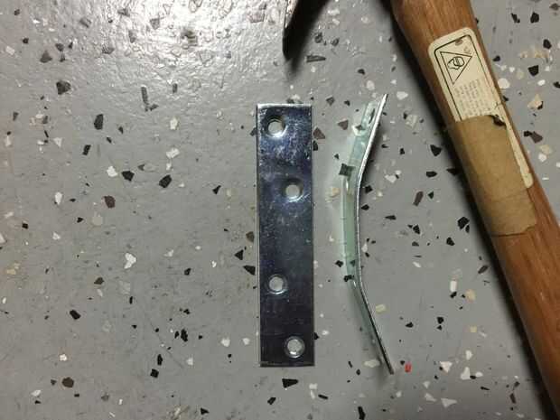 Usted tendrá que doblar dos de las placas de mend para ajustar la curva de la parte posterior de la "Gobo". Usé un martillo y un ladrillo en el piso de concreto para doblar en el lugar. Asegúrese de que alinean los orificios de las placas de mend. Se necesita una placa curva en la parte posterior y uno en el frente. Tendrá que hacerlo dos veces porque necesita la parte superior y la parte inferior de la "Gobo".