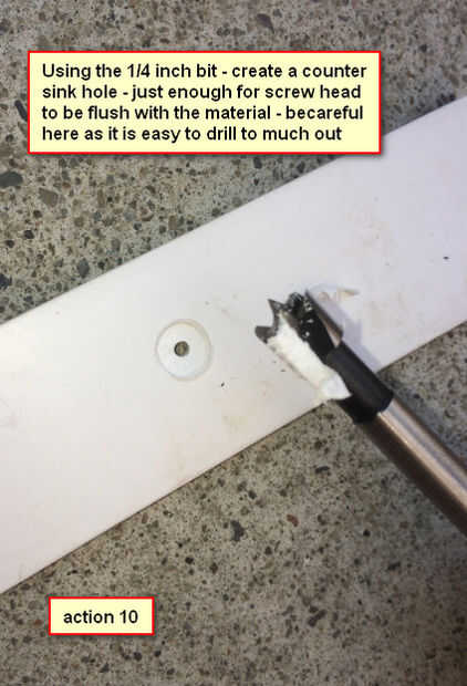 Usando 1/4 pulgada broca - crear un agujero del fregadero mostrador - lo suficiente para la cabeza del tornillo a ras con el material - ten cuidado que es fácil de perforar hasta mucho