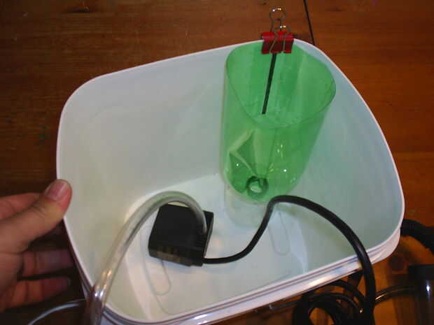 Lo primero que necesitas hacer es cortar la parte inferior de la botella de 2L y corte una sección de la botella de 1 L lo ponen debajo de lo 2 L para un espaciador.  Situado en el cubo y utilizar uno de los clips para sujetar al lado. Entonces ponen el bateo en la botella de 2L.