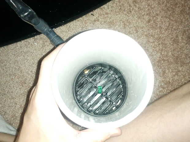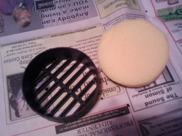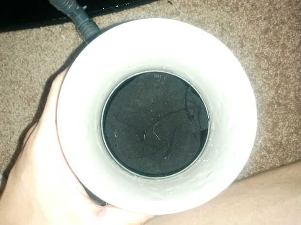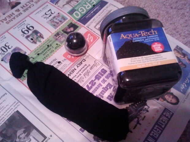 la segunda cesta contiene el carbón activado. compré algunas rodillas panty de la manguera de un cierto centro super y vierte una cantidad decente. no es relleno por anymeans. tal vez tiene una taza vale de carbón en ella. zona atar el extremo con un nudo por lo que posiblemente puede reutilizarla. póngala en la canasta alrededor de la brida y reorganizar el carbón para que quede bien.