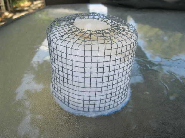 después de mirar algunas de las otras sugerencias que pensé que podría subir con mi propia versión de un filtro de la piscina. y que sea reutilizable. Así que empecé con un filtro que había lavado y blanqueado un par de veces. Hay una tapa de plástico superior e inferior incrustada en el papel de filtro. El núcleo plástico es sostenido en lugar por el papel y las tapas. Usted necesitará lo siguiente: