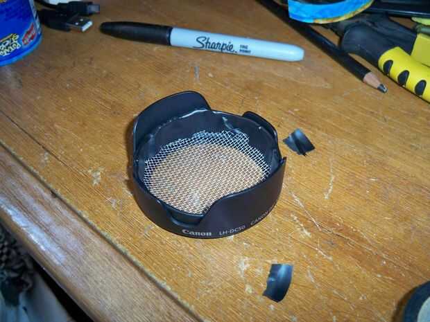 Una vez que tenga todo grabado hacia abajo (o pegado), prueba de colocarlo en el parasol del objetivo. Si cabe entonces todo lo que tiene izquierda hacerlo pone alguna cinta en el exterior sólo para darle un aspecto un poco más acabado y proteger la campana de arañazos.