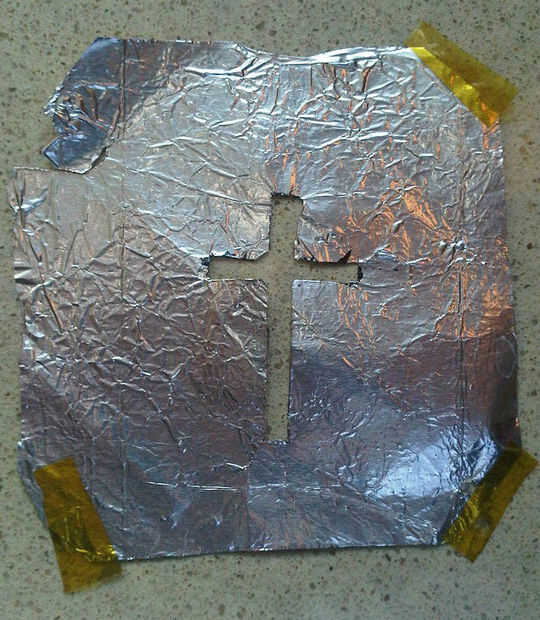 áreas del marco para montar en. Mide la apertura y determina un tamaño para el filtro de papel de aluminio, 4" fue elegido. La forma de la hoja de aluminio se cortó con un cuchillo X-Acto después de colocar en una placa de scrap liso. Otras técnicas de corte tales como sellos de escarpa-reserva deberían funcionar así.