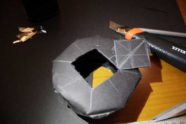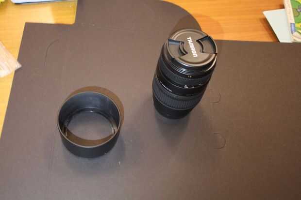 Inicio doblando las 4 esquinas en el parasol del objetivo, para que se ajuste lo tiene que hacer 8 cortes: dos para cada curva que se forma en el centro del borde cuadrado, otro a su izquierda y uno en él tiene razón.
