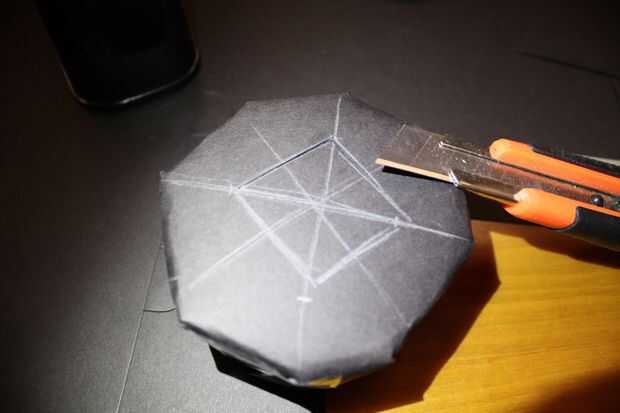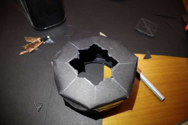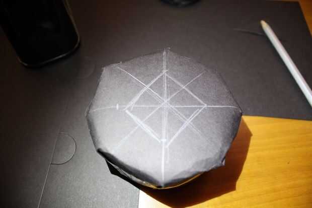Girar alrededor y traza líneas para encontrar un punto cerca del centro, y luego dibujar un cuadrado y cortar con un cortador. Tienes que dejar espacio suficiente para el filtro de la cinta hacia abajo y mantener de alguna manera bajo tensión. Después de la primera plaza dibujar otro 4 esquinas (como otro cuadrado pero 45°) y cortarlas también.