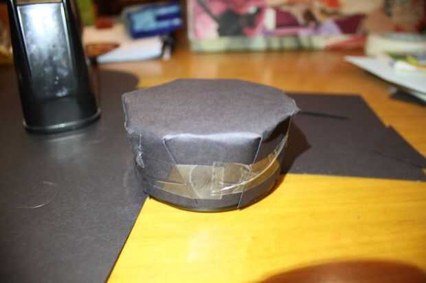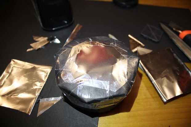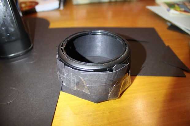 Veces todos juntos y cinta hacia abajo, usted debe tener algo como en la foto. Es firme en su lugar con ninguna cinta entre el cartón y el parasol del objetivo.