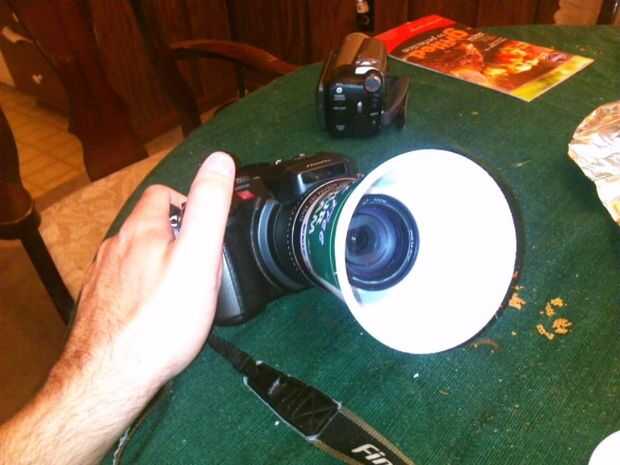Paso 1: cortar un agujero en el extremo estrecho del recipiente plástico.  Ello se ajusta sobre la lente.  Como objetivo para un ajuste apretado un poco, para que no caiga fuera de la cámara, pero no va demasiado ajustada para que tenga fuerza en (podría dañar el motor)