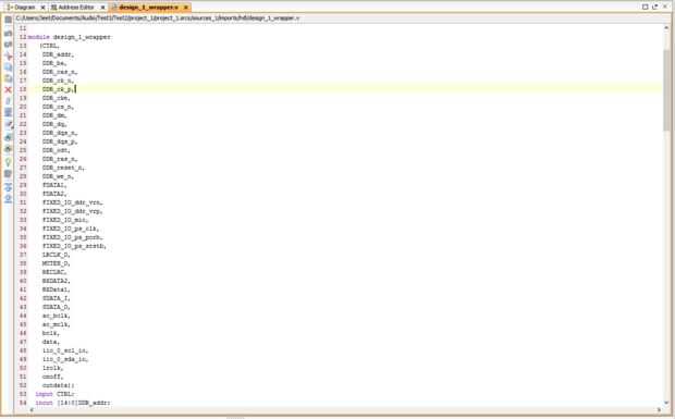 Haga clic en la pestaña de fuentes en el panel de fuentes justo al lado del navegador de flujo. Haga clic derecho sobre el archivo "design_1.bd" bajo "Fuentes de diseño" y seleccionar "Crear contenedor de HDL". Seleccione "copia generado envoltura para permitir ediciones de usuario". Asegúrese de que todos los insumos externos y puertos de salida generados en el diseño de bloque se asignan en el contenedor. Por ejemplo en la figura encima de CTRL, SDATA_O, SDATA_I son todos los insumos externos y salidas en el diseño de bloque que también forman parte de la envoltura.