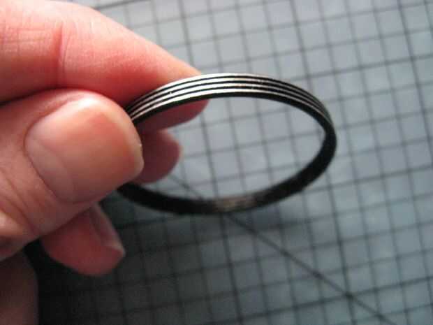 Tomé el anillo en mi mano y tiró contra el grano del papel de lija mientras forzando el anillo para hacer 1/4 vuelta. Repita para el próximo trimestre gire y mantenga hacerlo y comprobar el ajuste de vez en cuando. Me tomó tal vez cinco minutos para llevar el diámetro hasta el tamaño adecuado.