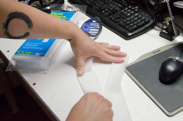 Tomar un filtro de paquete y dóblalo por la mitad a lo largo de su borde largo. Cortar esa línea que te dejará dos 2 pulgadas por 12 pulgadas filtros. Usted puede cortar el que otra vez a lo largo del lado corto dejando cuatro 2 pulgadas por 6 pulgadas filtros también.