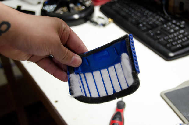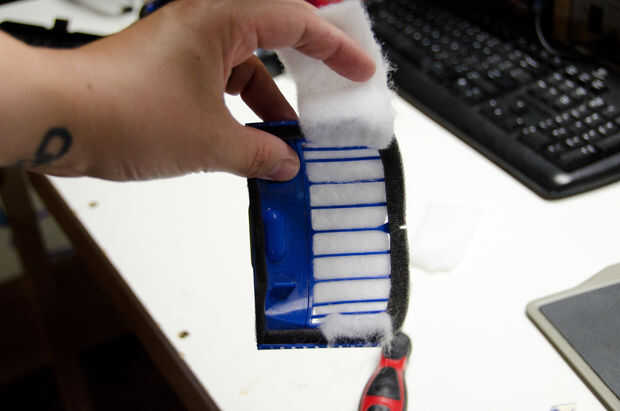 Doblar el material de filtro adicional para el interior de la cesta y cortarlo. Quiere dejar suficiente material para que cuando el filtro se sustituye en la roomba, se mantiene presionado por el filtro de canasta.