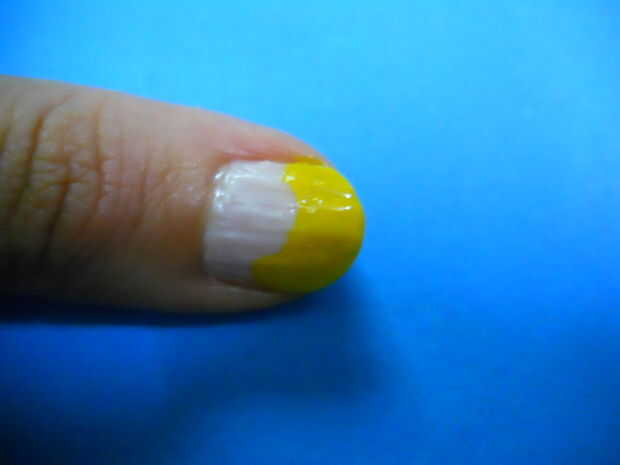 aplica esmalte de uñas de tu color favorito y en el punto del clavo otro color de esmalte de uñas. u no tiene que preocuparse acerca de cómo se está alineado porque vamos a colocar rodajas de fimo en la articulación de dos colores