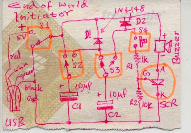 Cuando S1 se enciende, si S2 está en el descanso cargos de posición (indicada) C1 a la tensión de alimentación de 5 voltios. Cuando se acciona S2, si S3 está en la posición de reposo (también como se muestra) la carga se redistribuye con C2, y puesto que sus capacidades son iguales cobran de media tensión, alrededor de 2,5 voltios. Entonces si S3 es excedente cambiante, un contacto de la tecla obtiene este voltaje. Ahora pulsar este botón se aplica una corriente a la puerta de lo SCR a través de R1 y se enciende. R2 lo impide encender debido a la activación transitoria en el plomo de la puerta. Incluso después de retirar la unidad de la puerta debido al condensador C2 quedando sin carga el SCR permanecerá 'en' y sólo se apaga cuando se apaga el interruptor S1.