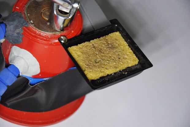Porque no se recomienda para utilizar sólo el alambre de latón para limpiar la punta del soldador, también he añadido una pequeña esponja: tuve una pequeña bandeja de metal de un viejo soporte de soldador que derrite, porque algunos fabricantes probablemente no saben que un soporte tiene que estar hecho de material resistente al calor! Puede utilizar una tapa de un tarro de masón, es aproximadamente el mismo tamaño.