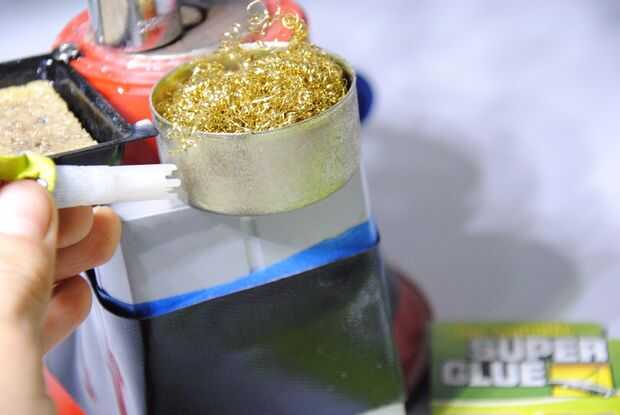 Pensé que sería bonito tener una "estación de limpieza" para soldar hierro punta, tan I súper pegado un escudo del altavoz (la parte que cubre el imán) en el peso del plomo y llena de alambre de latón. Esto sirve como una copa de metal que sostiene el alambre de latón que limpia la punta del soldador.