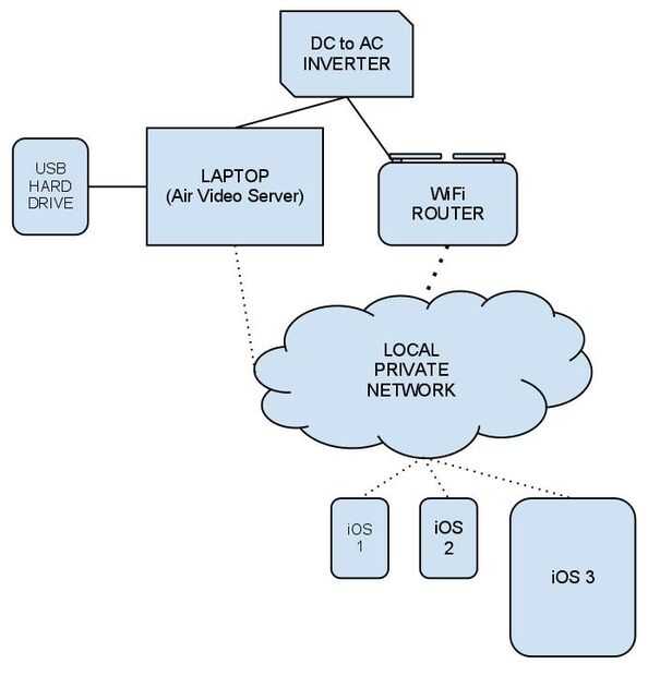 He configurado el sistema de entretenimiento móvil definitiva para este problema. Esta configuración simple permite que cada persona en el vehículo para ver películas independientemente en su propio dispositivo, todo streaming "en vivo" de un ordenador portátil centralizado.